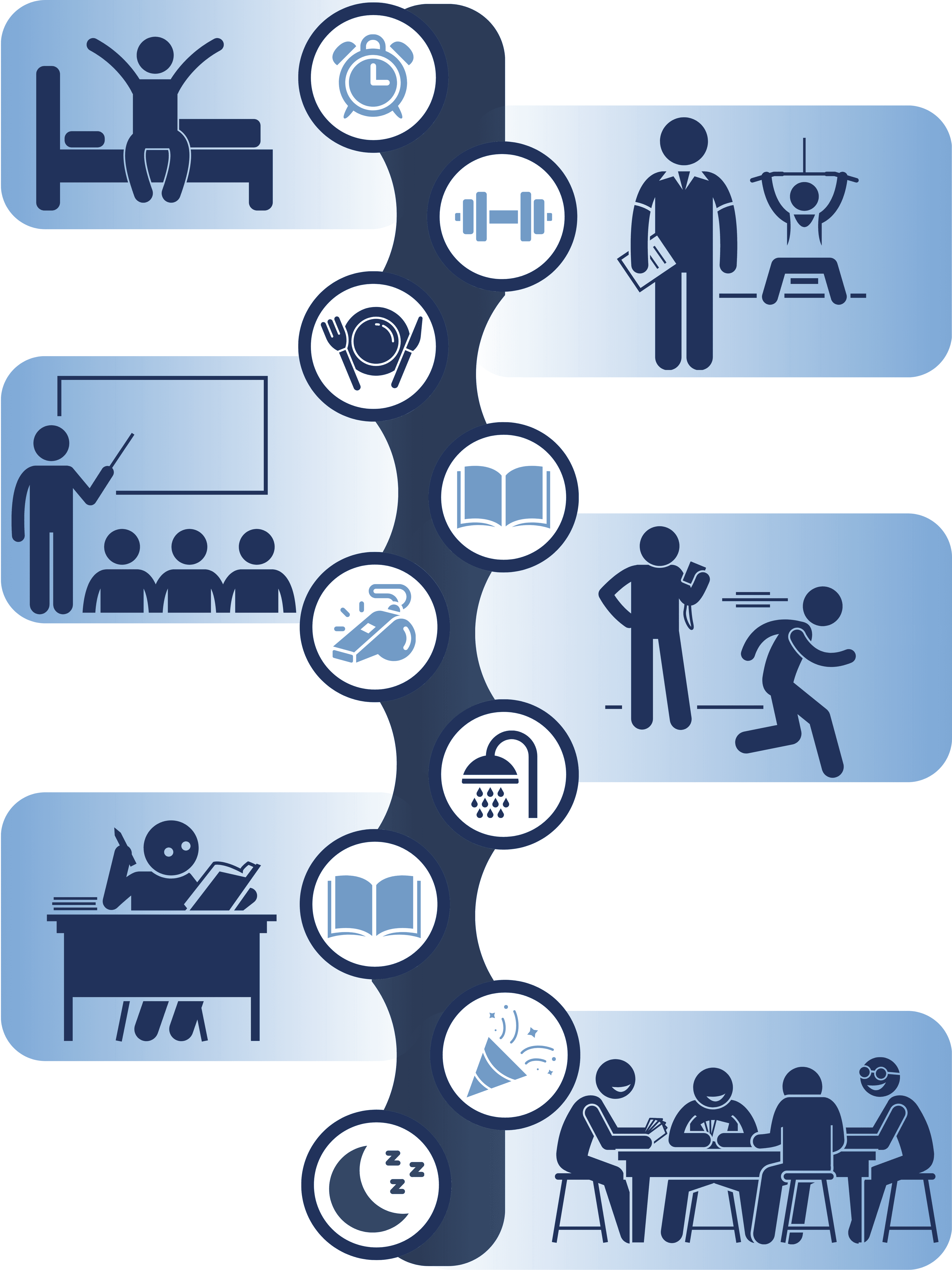 Depending on the time of the year, most student-athletes start their day with an early morning practice, which means getting up early. These practices might include specialized strength and conditioning workouts in the weight room, focusing on explosive power and injury prevention, or specific event work like technique drills, short sprints, or light distance runs on the track. These sessions typically last one to two hours. After the early workout or practice, athletes go to the cafeteria to eat breakfast, followed by classes, usually between 8:00 a.m. and noon. After that, it’s lunch time together in the dining hall with their teammates or other friends.